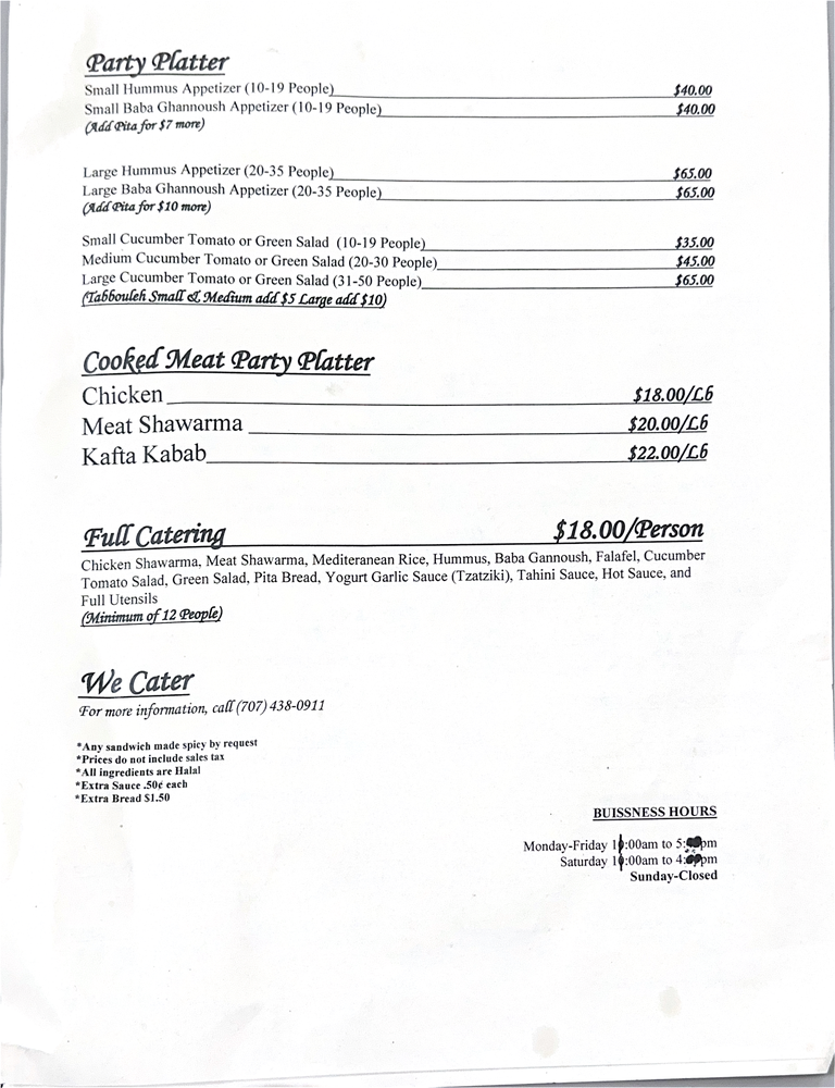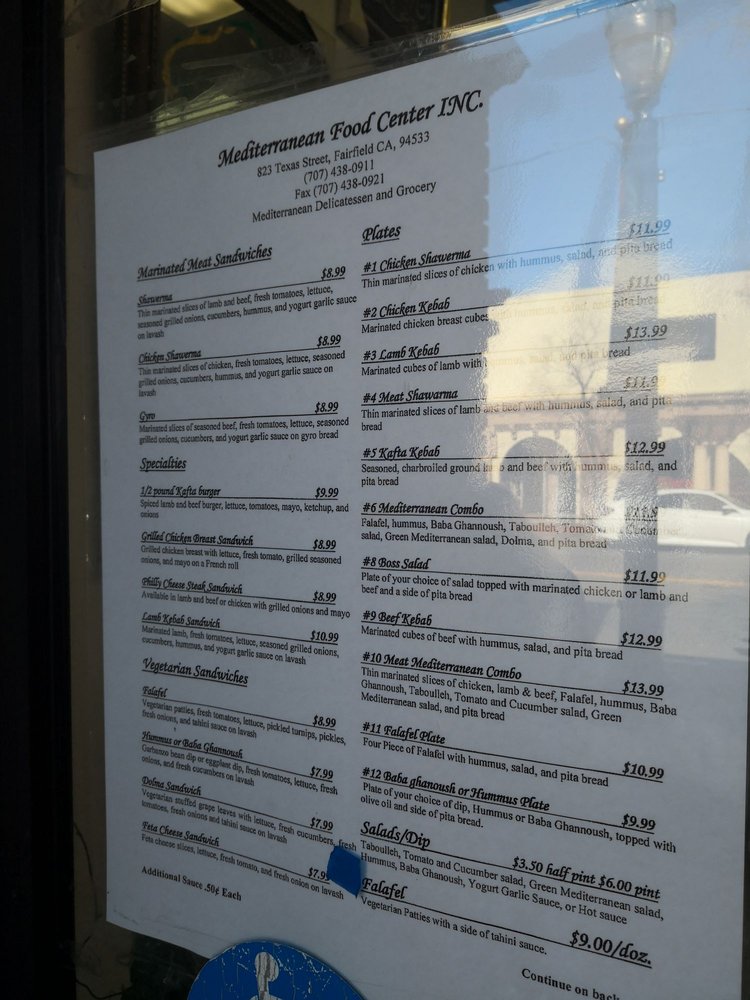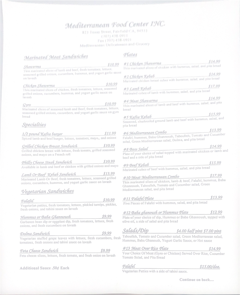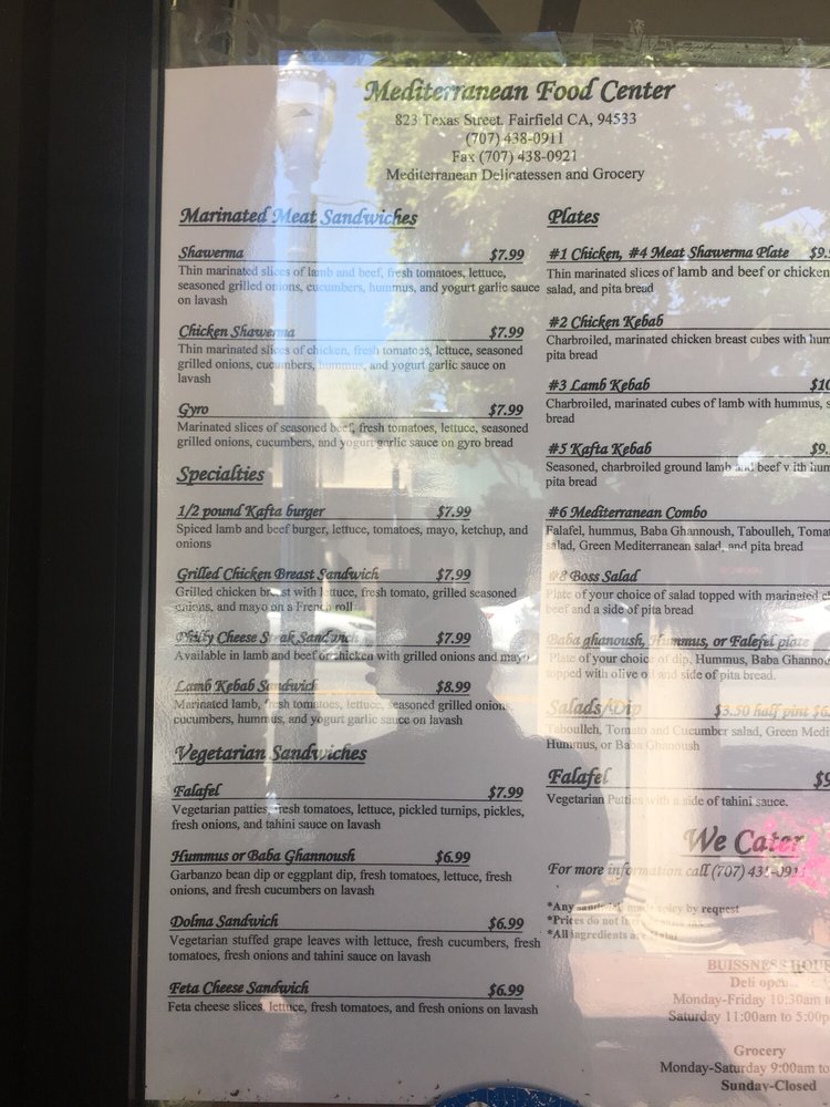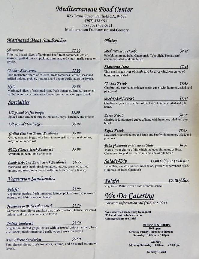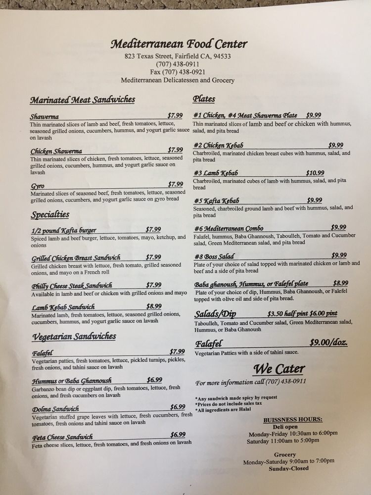Introducing the menu at Mediterranean Food, located in Fairfield, CA, offers a delightful array of Mediterranean dishes. The restaurant provides a classy yet casual dining experience with various amenities like delivery, takeout, reservations, and outdoor seating. Customers rave about the flavorful dishes, such as chicken shawarma, hummus, baba ghanoush, and meat shawarma plates. The portions are generous and the meat is grilled to perfection upon ordering. The service is warm and attentive, creating a welcoming atmosphere for diners. The menu also includes imported goodies and a variety of options for vegetarians. Overall, Mediterranean Food impresses with its authentic and tasty Mediterranean cuisine, making it a must-visit spot for food enthusiasts in the area.